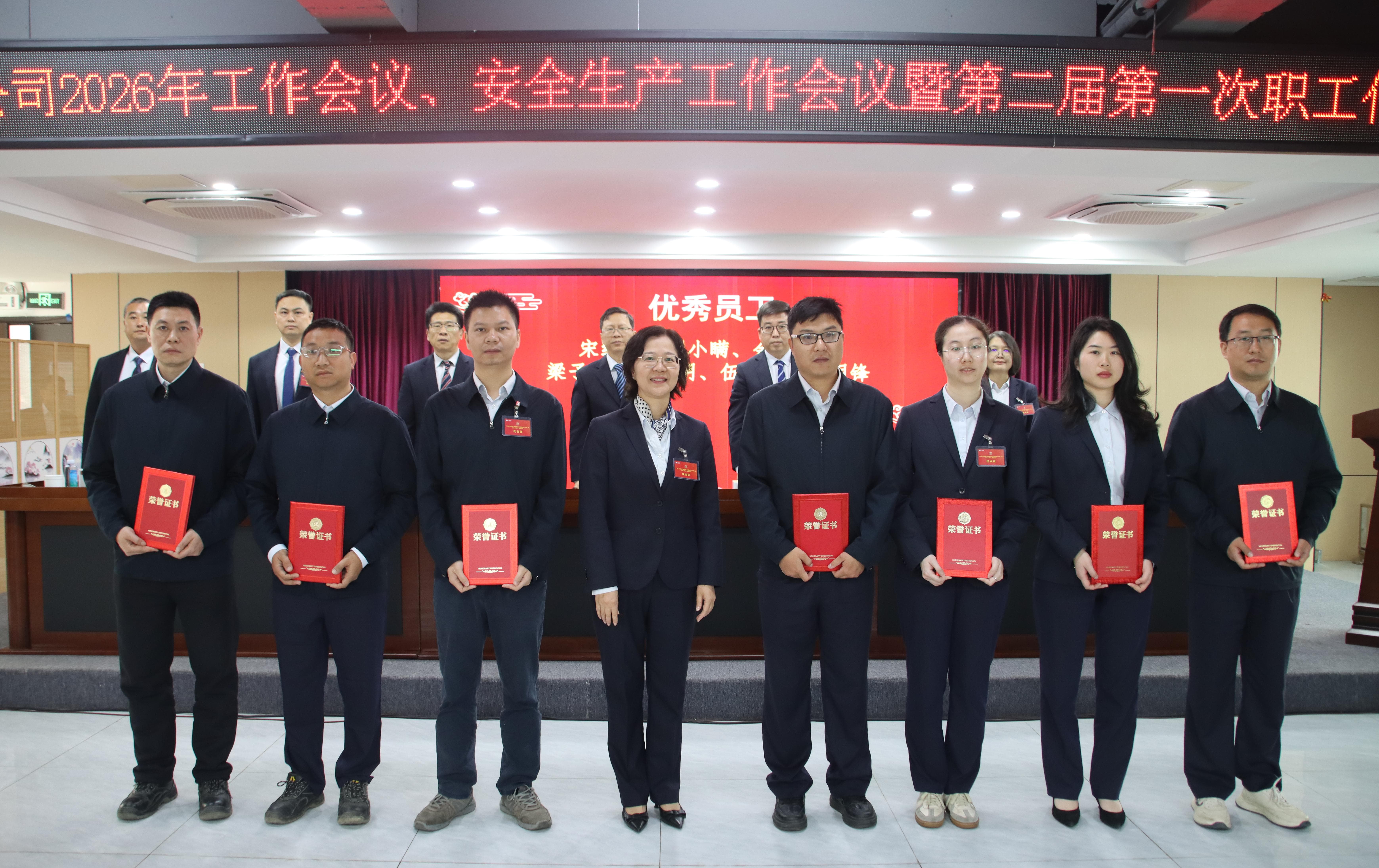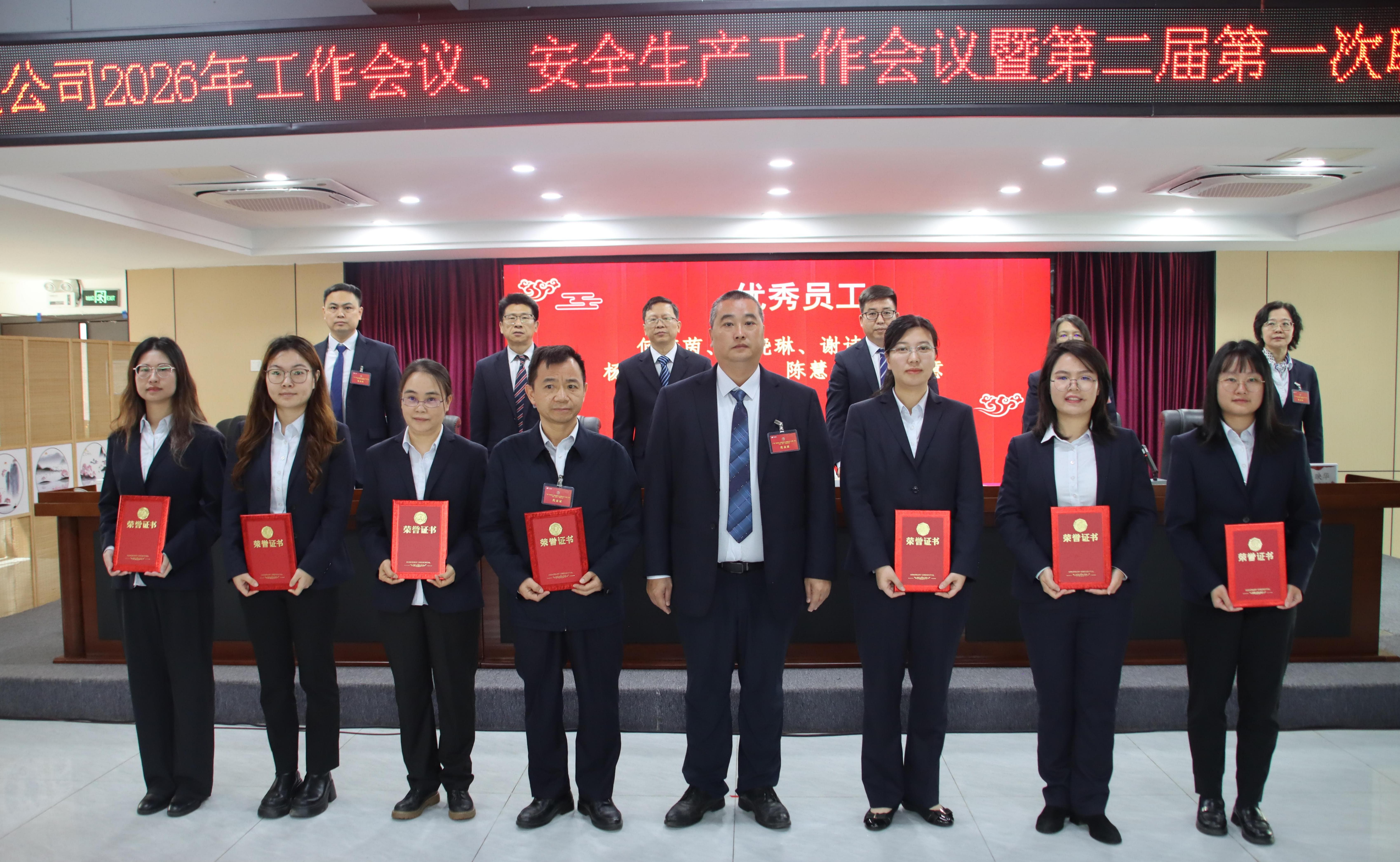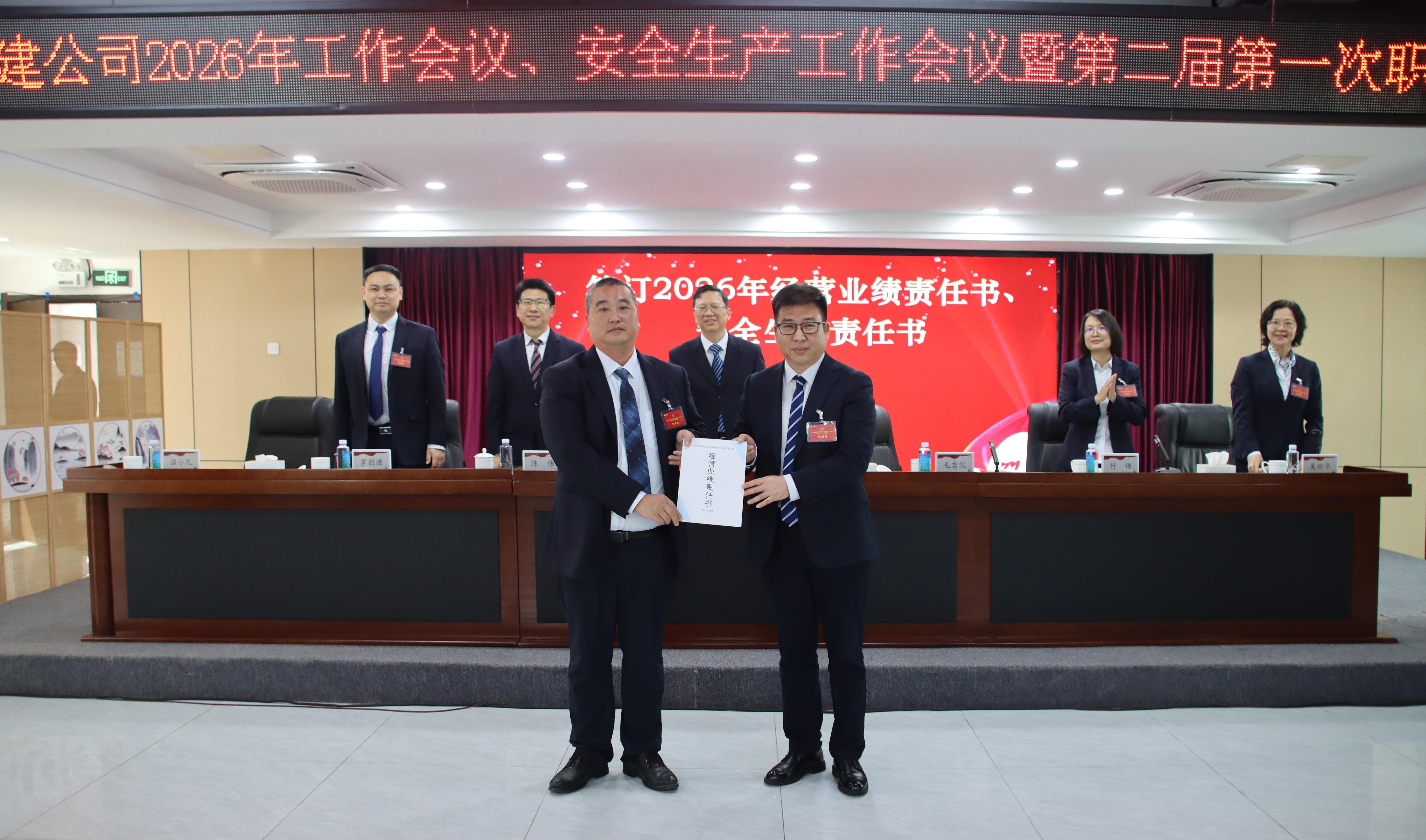 会议表彰了2025年度各项工作先进集体、先进个人,优秀中层代表、优秀员工代表分享了工作经验。公司领导与部门(机构)代表签订了《2026年经营业绩责任书》和《2026年安全生产责任书》。会议审议并表决通过了《广建公司第二届第一次职工代表大会关于公司2025年工作报告的决议(草案)》,圆满完成各项议程。