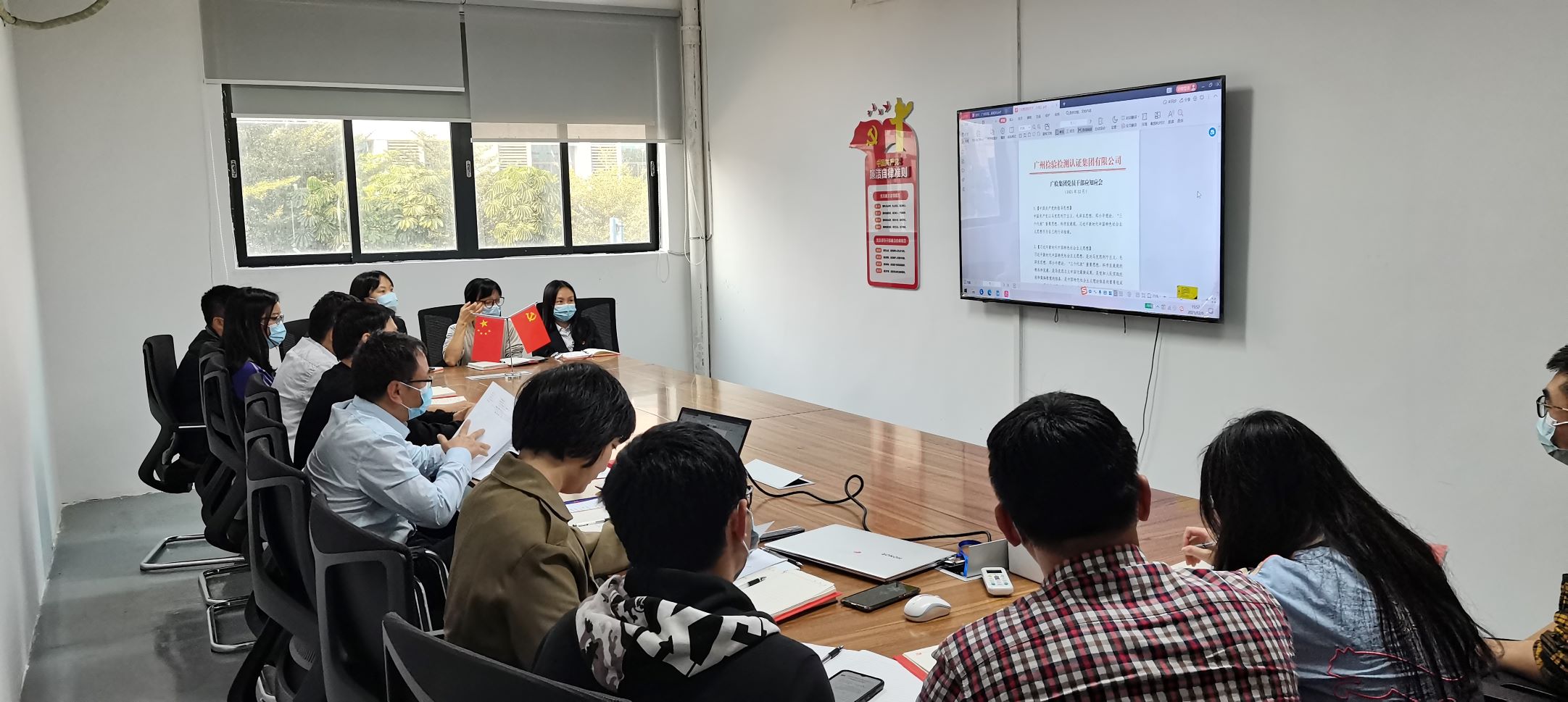 随后,广技公司开展以“加强政策理论学习,集体过政治生日”为主题的党日活动。综合部党员李启铬、组织宣传委员王利娜分别领学了《中国共产党党徽党旗条例》、《广州检验检测认证集团有限公司“十四五”(2021-2025年)发展规划》,了解党徽党旗使用和管理的有关内容,同时充分领会集团“十四五”规划的战略目标。全体党员一起朗读了《广检集团党员干部应知应会》节选,并共同为入党时间为下半年的党员集体过政治生日,送上生日寄语。